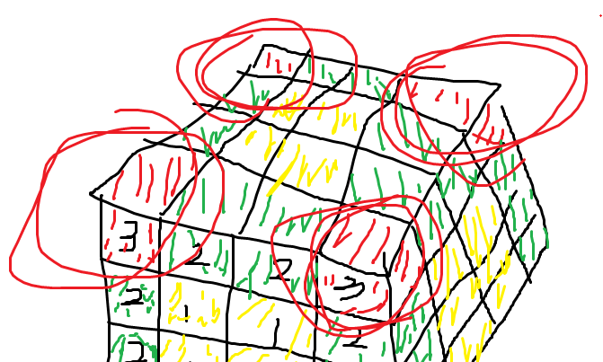 N이 2 이상일 때 각 블럭은 보이는 면이 1,2,3개인 주사위들로 이루어져 있습니다.