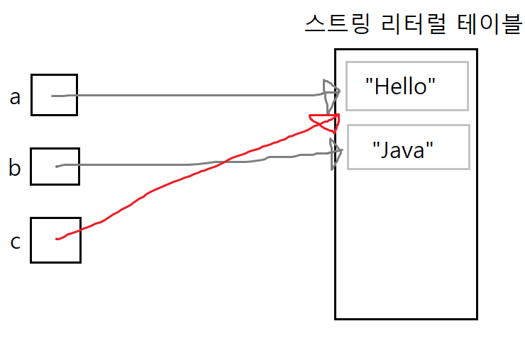 - 자바 가상 기계 내부에서 리터럴 테이블(정적 메모리)에 저장되고 관리됨.