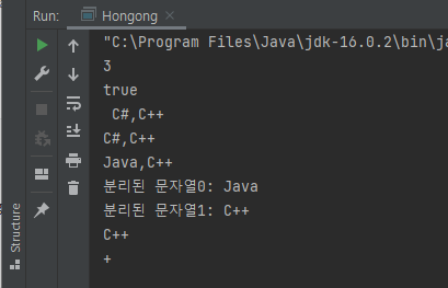 | String[] split(String regex) | regex와 일치하는 문자들을 기준으로 분리된 스트링을 배열에 저장하여 리턴 |