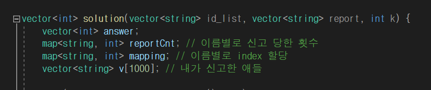 v : v[index] -> 고유한 번호에 해당하는 사람이 신고한 애들의 이름들을 vector로 저장할 것이다.
