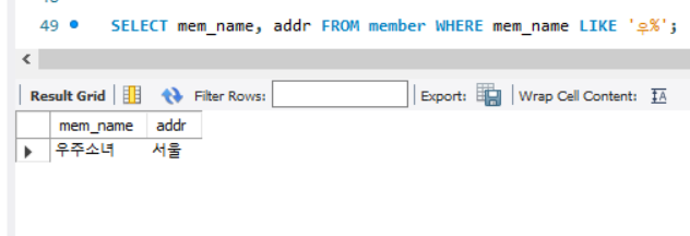 이름(mem_name)이 '우'로 시작하는 회원을 검색하려면 아래와 같이 한다.