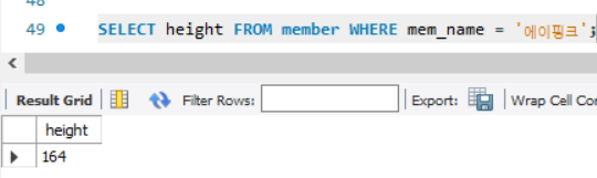 키 164를 대신하여 에이핑크의 height를 찾는 쿼리를 넣어준 것이다.