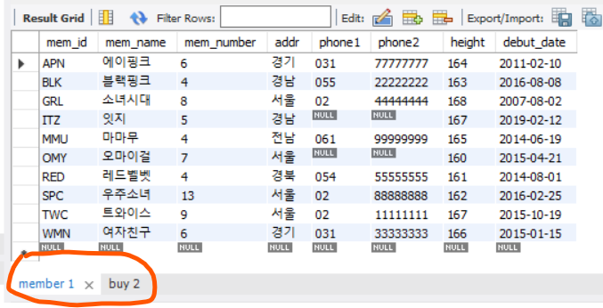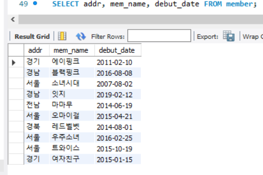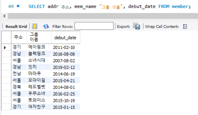 SELECT addr 주소, mem_name "그룹 이름", debut_date FROM member;