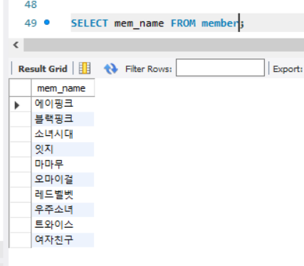 찾는 이름(mem_name)이 '블랙핑크' 라면