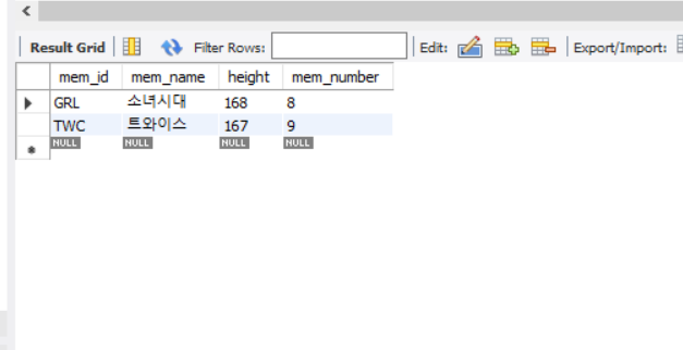 INSERT INTO member VALUES('TWC', '트와이스', 9, '서울', '02', '11111111', 167, '2015.10.19');