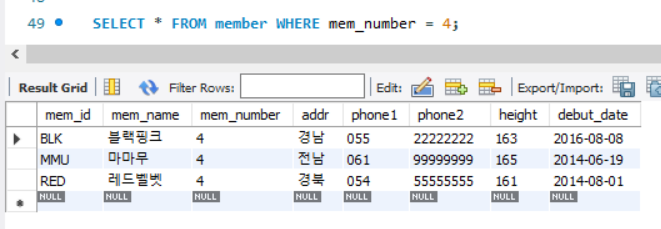 만약 인원(mem_number)과 같은 숫자형 열을 조회할 때는 작은따옴표가 필요 없다.