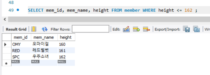 키(height)와 같이 숫자로 구성된 데이터는 크다/작다의 범위를 지정할 수 있으므로 BETWEEN ~ AND를 사용할 수 있었지