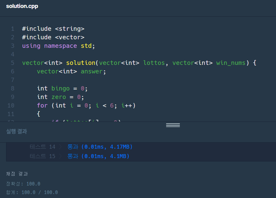 [프로그래머스] 로또의 최고 순위와 최저 순위 C++ 풀이 본문