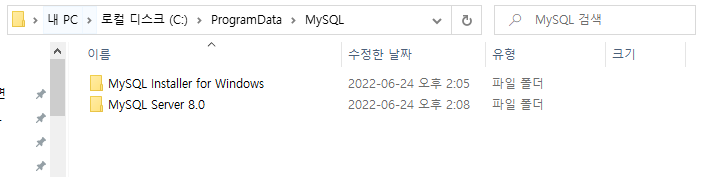 아래의 경로에 MySQL 폴더를 지워버린후 ( ProgramData는 숨겨진 폴더라 숨겨진 폴더를 보기해야 한다. )