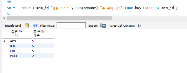 SELECT mem_id "회원 아이디", SUM(amount) "총 구매 개수" FROM buy GROUP BY mem_id ;