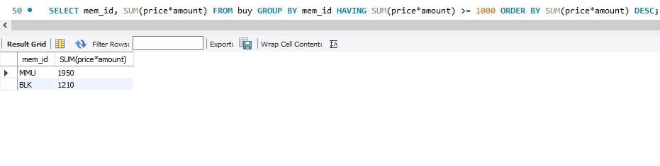 SELECT mem_id, SUM(price*amount) FROM buy GROUP BY mem_id HAVING SUM(price*amount) >= 1000 ;