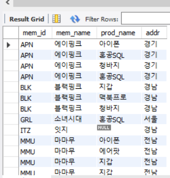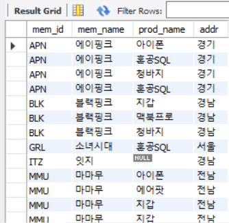 중간에 물건을 구매하지 않아서 회원 정보는 뜨지만 NULL로 표시가 되는 행이 생겼다.