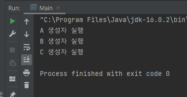 여기서 C 클래스의 객체를 생성하면 A-B-C순서로 생성자가 실행 된다.