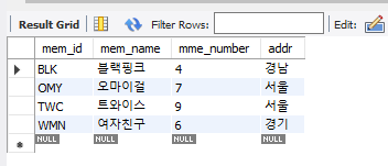 INSERT INTO member VALUES('WMN', '여자친구', 6, '경기');