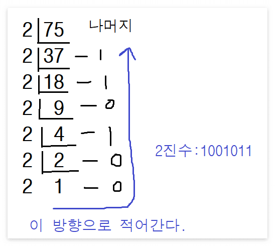 75를 2로 나누어 나머지를 적어가고 몫을 또 2로 나누어가며 반복하면 된다.