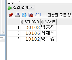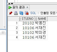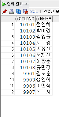 EX) 학생 테이블과 교수 테이블에서 101번 학과에 소속된 교수와 학생의 번호와 이름을 출력