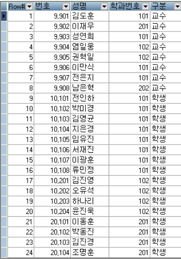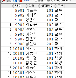 SELECT profno "번호", name "성명", deptno "학과번호", '교수' "구분"