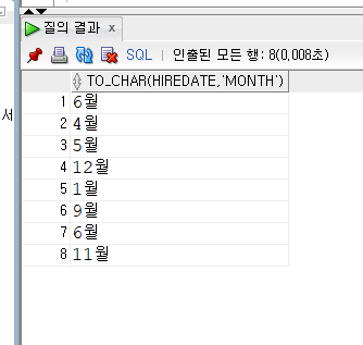 | MONTHS_BETWEEN | 날짜와 날짜사이의 개월을 계산 | 숫자 |
