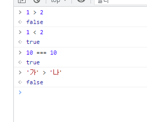 -> '가' 보다 '나' 가 사전상 더 뒤에 있으므로 거짓.