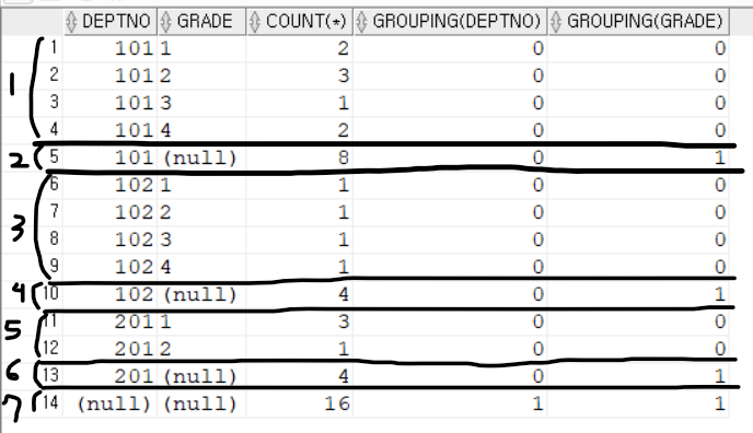 SELECT deptno, grade, COUNT(*), GROUPING(deptno), GROUPING(grade)