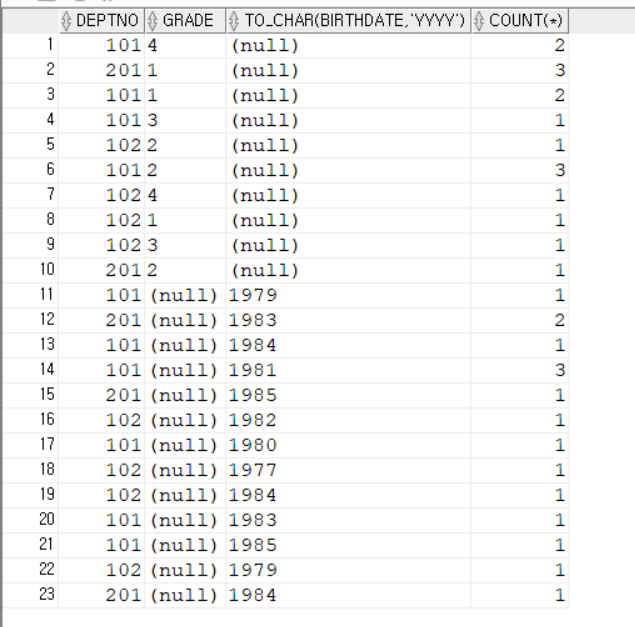 GROUP BY GROUPING SETS((deptno, grade), (deptno, TO_CHAR(birthdate, 'YYYY')));