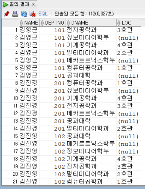 카티션 곱을 하면 총 16*7=112건의 데이터가 생성될 것이다.