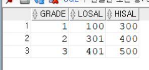EX) NON-EQUI JOIN으로 교수 테이블과 등급 테이블을 통해 교수별로 급여 등급 출력