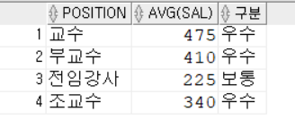 SELECT position, AVG(sal), CASE WHEN AVG(sal) > 300 THEN '우수' ELSE '보통' END "구분"