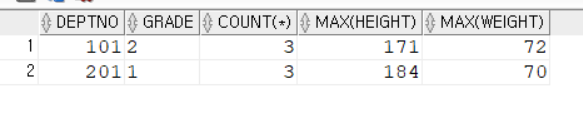 SELECT deptno, grade, COUNT(*), MAX(height), MAX(weight)