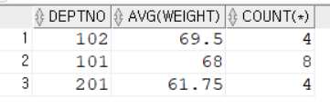 SELECT deptno, AVG(weight), COUNT(*)