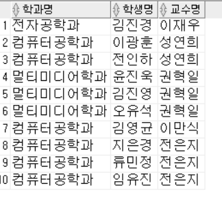 7번 - 각 학과에 소속된 학과명, 학생명, 교수명을 모두 출력
