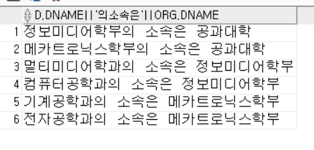 SELECT d.dname || '의 소속은 ' || org.dname