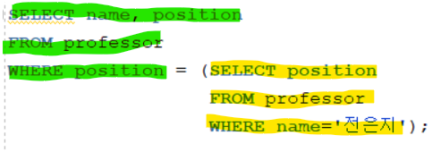 예시에서 서비쿼리의 결과로 '전은지'의 직급(position)이 나와 메인쿼리의 조건으로 사용하고있다.