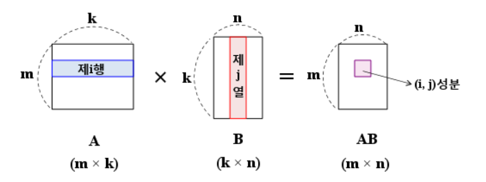 결과 행렬 (i,j)의 성분은 행렬 A의 i행과 행렬 B의 j열의 곱입니다.