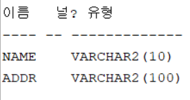 테이블의 생성 여부, 구조, 칼럼 이름, 데이터 타입과 크기, NOT NULL 무결성 제약조건 확인 가능하다.