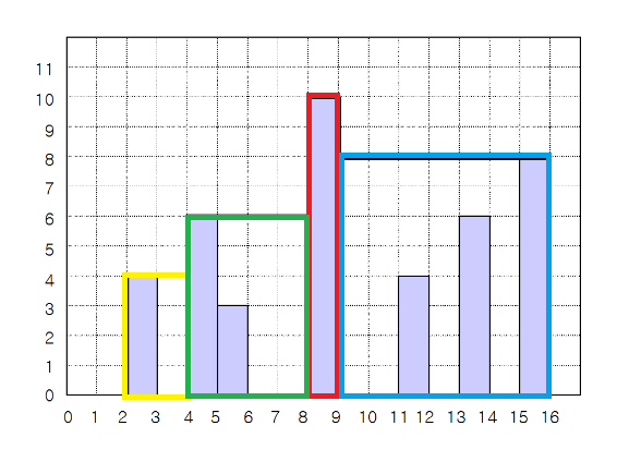 위 그림처럼 최대 높이의 인덱스를 기준으로 왼쪽 영역과 오른쪽 영역의 넓이를 구하면 됩니다.