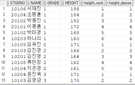 DENSE_RANK() OVER (PARTITION BY grade ORDER BY height DESC) "height_dense"
