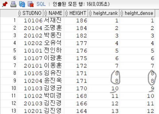 DESNE_RANK 함수는 연속적으로 9위부터 시작한다.