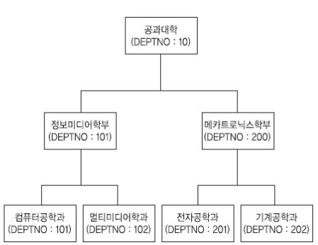 - 관계형 데이터 베이스에서 데이터간의 부모 자식 관계를 표현할 수 있는 칼럼을 계층적인 관계로 표현