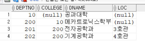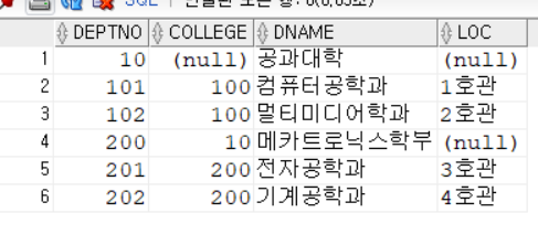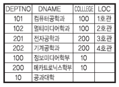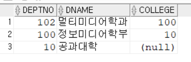 deptno는 부서 번호이며 college는 그 부서의 상위 부서 번호를 나타낸다.