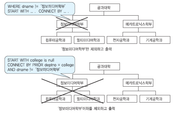 - WHERE 절이나 CONNECT BY 절을 이용하여 계층 구조의 일부를 제거하고 출력할 수 있다.