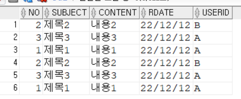 VALUES (2, '제목2', '내용2', SYSDATE, 'B');