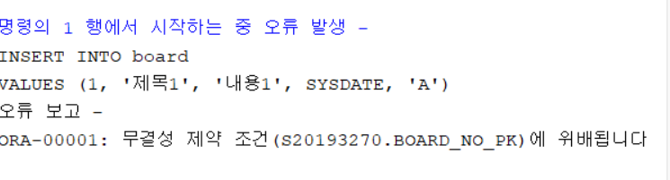 똑같은 쿼리를 실행하면 게시물 번호가 PK인데 중복이 일어나 삽입이 안된다.