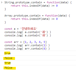 이것을 이용하여 문자열, 배열에 해당 값이 있는지 없는지 true, false로 반환하는 contain 메소드를 만든다.