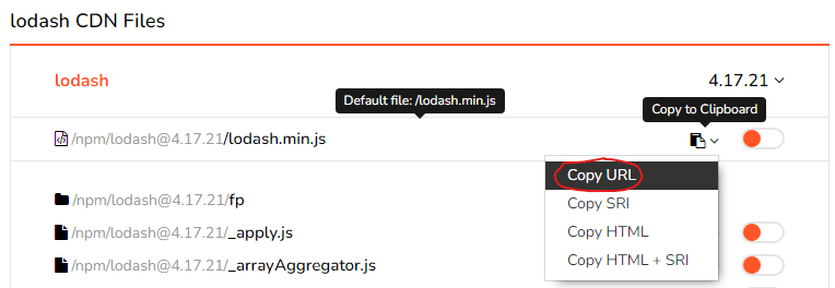 lodash 홈페이지에서 CDN copies를 눌러 링크를 복사한다.