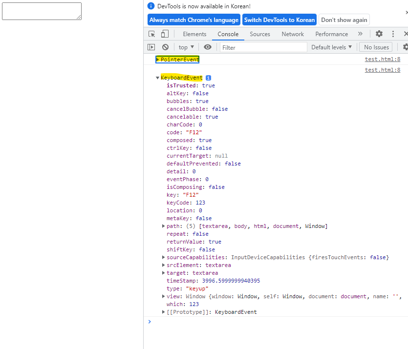 textarea에 클릭과 키보드 이벤트를 통해 event에 무엇이 전달되는지 찍어봤다.
