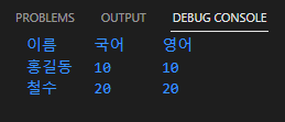 output += `${s.이름}\t${s.국어}\t${s.영어}\n`