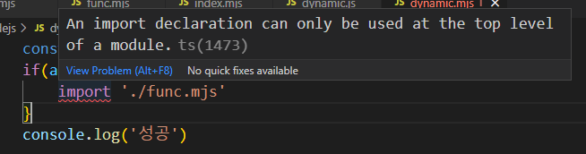CommonJS 모듈에서는 다이나믹 임포트가 가능하고, ES 모듈에서는 불가능하다. 하지만 다른 방법으로