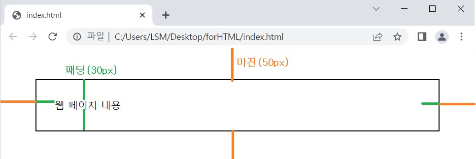 padding: 경계선과 HTML 요소 사이의 간격을 의미.