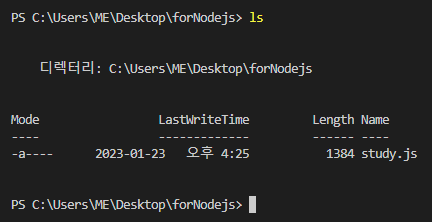 C:\Users\ME 위치가 된다. 여기서 '\\forNodejs'로 이동하였으니 ME에서 forNodejs 디렉토리로 이동한게 결과가 된다.